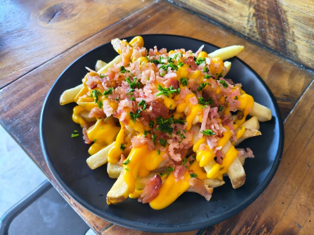 El universo en tu boca, 300 grs de papas a la francesa con queso cheddar fundido y tocino meteórico crujiente