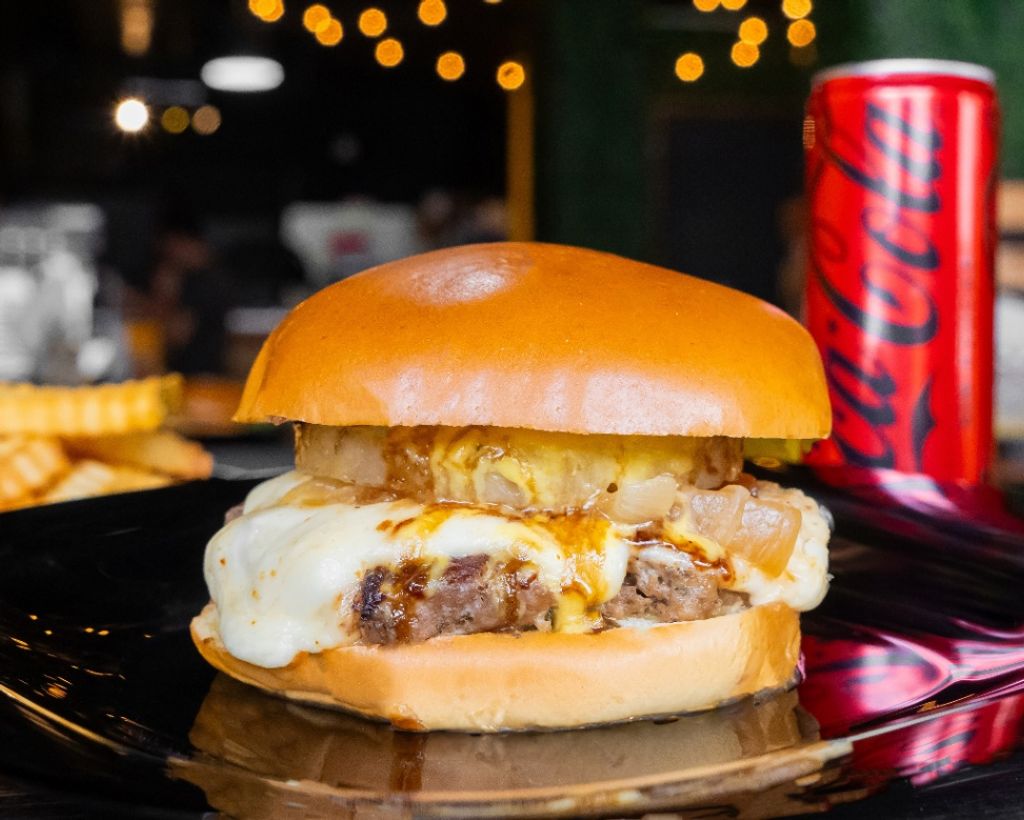 Pan brioche cósmico, 125gr de carne de res interplanetaria, queso oaxaca derretido, cebolla asada orbital, piña asada sazonada con nuestra salsa teriyaki espacial y aderezo de maíz fuera de este mundo. Incluye Papas y Bebida a elegir.
