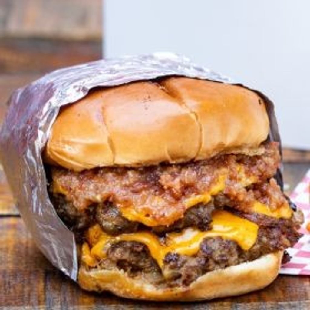 Pan brioche cósmico, 250gr de carne de res interplanetaria, queso americano espacial, cebolla asada orbital, mermelada de tocino y aderezo de ajo.