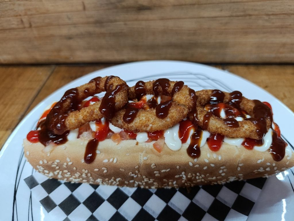Pan espacial jumbo con salchicha jumbo, mayonesa lunar, catsup, anillos solares (aros de cebolla), jitomate y un baño de salsa BBQ ahumada interplanetaria.