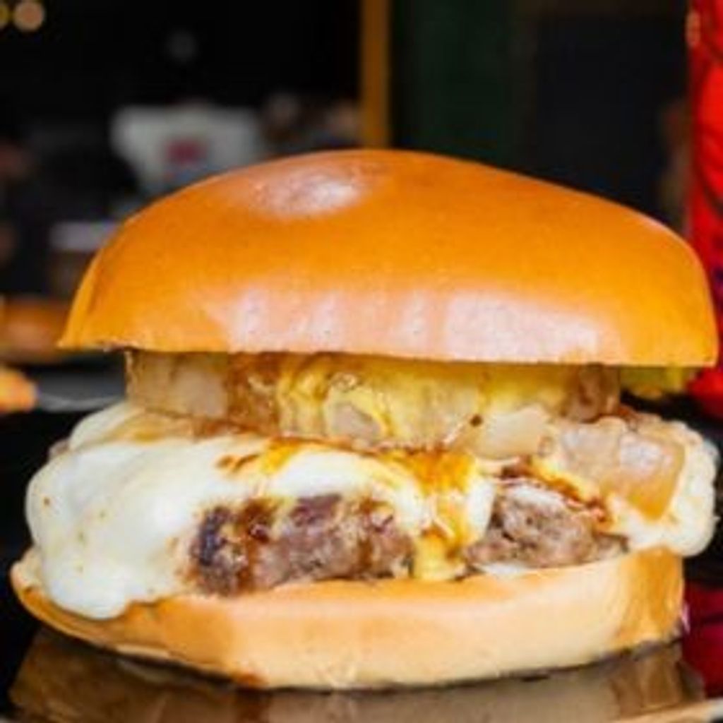 Pan brioche cósmico, 125gr de carne de res interplanetaria, queso oaxaca derretido, cebolla asada orbital, piña asada sazonada con nuestra salsa teriyaki espacial y aderezo de maíz fuera de este mundo.