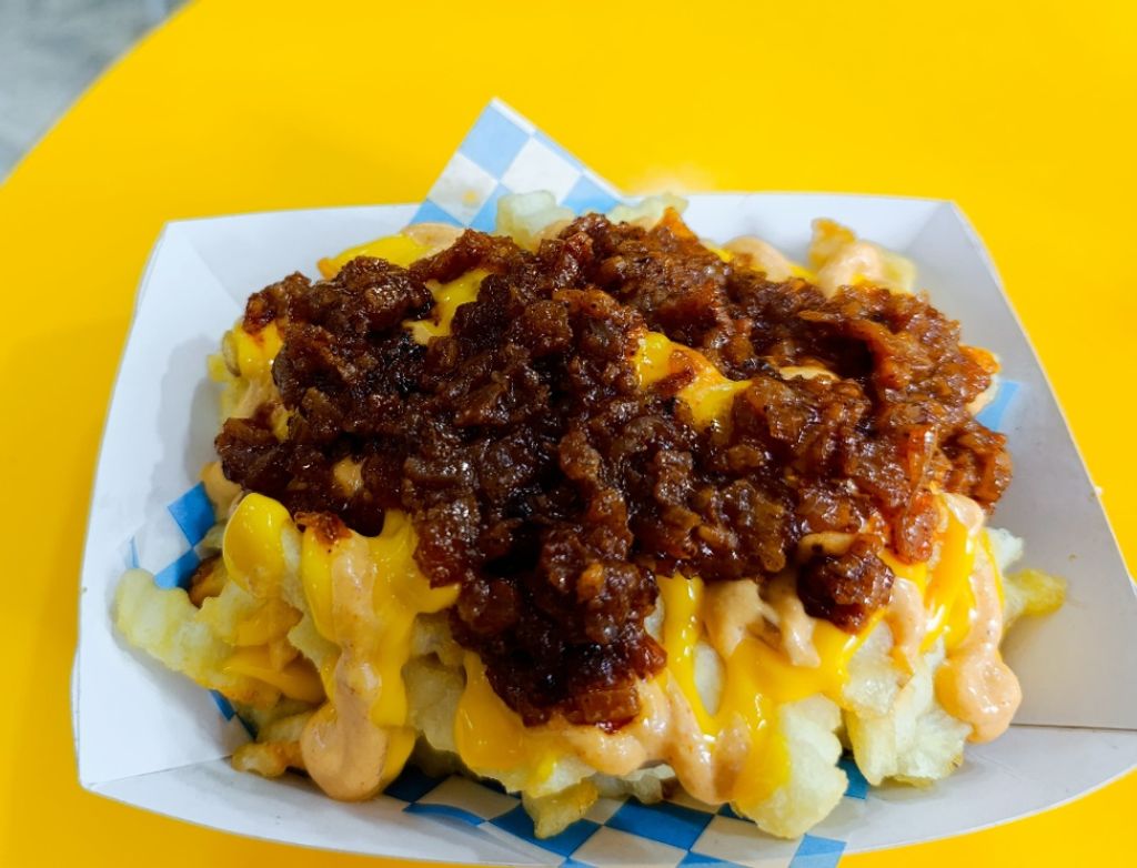 El top de la galaxia con 300 grs de papas a la francesa con queso cheddar fundido, aderezo tasty cósmico y mermelada espacial de tocino