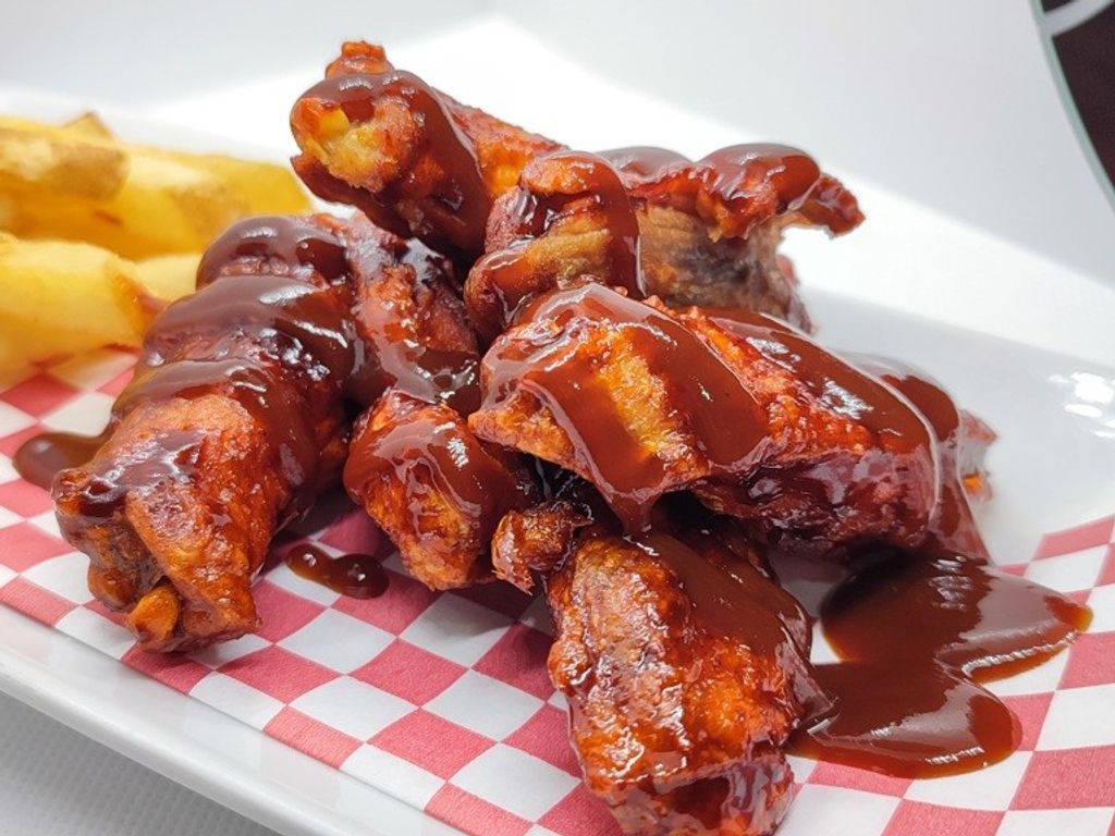 7 pzs de alitas jugosas, bañadas en la salsa de tu eleccion: bbq, parmesano, lemon pepper, bufalo, mango habanero